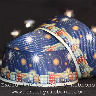 38mm grosgrain printed with Houses and Fireworks. Printed on one side only.